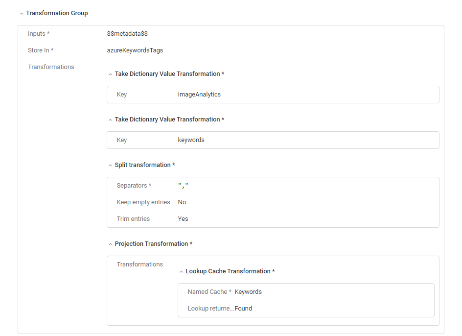 Before using a Projection Transformation and a Lookup Cache Transformation to match tags in your Keywords named cache